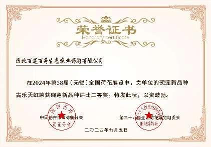 11 07月2024 了解詳情 百蓮百荷參加全國(guó)荷展獲全國(guó)荷花睡蓮新品種評(píng)比二等獎(jiǎng)! 第38屆全國(guó)荷花展覽于2024年7月4日在江蘇無(wú)錫市舉行,來自全國(guó)各地的荷花愛好者、園藝師以及企業(yè)代表齊聚一堂,共同見證了這場(chǎng)荷花界的盛世。我公司精心培育的荷花新品種“古樂天虹”與睡蓮新品種“拇指嬌娘”在本次競(jìng)賽中脫穎而出,榮獲了寶貴的二等獎(jiǎng)。